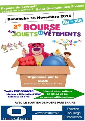 Le Comité de Gestion des Œuvres Sociales du personnel de la mairie de Saint-Germain-des-Fossés organise une braderie de vêtements et de jouets, le dimanche 15 novembre 2015, de 8 heures à 18 heures, à l'Espace du Levrault, salle polyvalente, située au lieu-dit « La Prat » (à côté de la piscine). Cette braderie est ouverte aux particuliers uniquement.