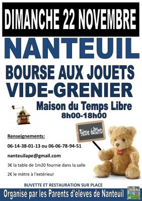 Les parents d'élèves de Nanteuil organisent une bourse aux jouets avec un vide-greniers. 3€ la table (fourni 1, 20m) à l'intérieur de la salle, uniquement des jeux, jouets, livres, articles de puériculture et vêtements pour enfants ou 2€ le mètre à l'extérieur pour tous les articles. Dimanche 22 novembre, à 8 h , Nanteuil. buvette et restauration sur place.