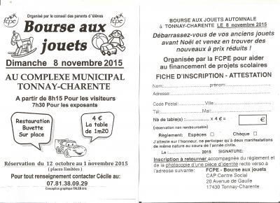 inscription à retouner avec règlement et photocopie d'une pièce d'identité recto verso à l'adresse suivante: FCP - Bourse aux jouets CAP centre social 20 av de Gaule 17430 Tonnay charente