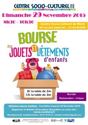 L'édition de la bourse aux Jouets et aux Vêtements 2015 va débuter d'ici peu de temps... Si vous souhaitez y participer, préparez dès maintenant votre bulletin d'inscription et votre règlement, et venez déposer ou envoyer votre dossier au Centre Socio-culturel de Bléré avant le 20 Novembre 2015. Les places sont limitées alors n'hésitez plus !