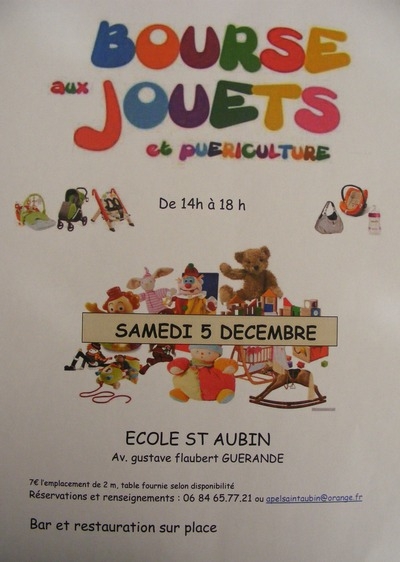 L'association des parents d'élèves de l'école Saint Aubin, vous invite à sa bourse aux jouets et puériculture.