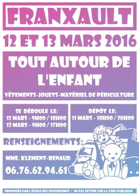 Contacter l'organisateur pour obtenir une liste ainsi que vos étiquettes pour vous permettre de préparer vos articles tranquillement chez vous. 30 articles pour les jouets et matériel de puériculture et 20 articles vêtements en lot ou à l'unité. Les dépôts se feront à la salle des fêtes le vendredi 11 mars de 18h à 20h. Les retraits se dérouleront le dimanche soir à partir de 18h30.