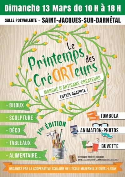 La coopérative scolaire de l'école maternelle Duval-Legay organise son 1 er marché d'artisans-créateurs pour accueillir le printemps, le dimanche 13 mars de 10h à 18h à la salle polyvalente de Saint-Jacques-sur-Darnétal.