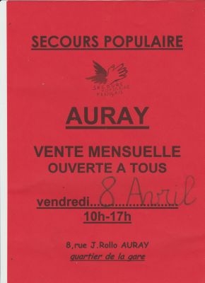 Le secours populaire d'AURAY (entre Vannes et Lorient) organise sa vente mensuelle, ouverte a tous.