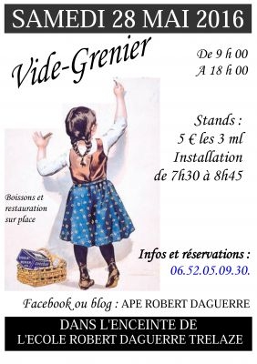 L'APE de l'école Robert Daguerre organise son vide Grenier 5€ les 3 mètres linéaires restauration sur Place Ambiance Sympathique et familiale.