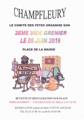 2eme vide grenier organisé par le comité des fêtes. buvette et restauration sur place. emplacement gratuit jusque 5 m et 1. 50€ au delà.
