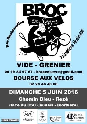 Installé sur le grand parking ombragé du chemin bleu, Broc en Sèvre est un vide greniers doublé d'une bourse aux vélos où il fait bon chiner. Organisé par un collectif de quatre associations humanitaires, avec le soutien du CSC, ce rendez-vous convivial est surtout le maillon d'une grande chaîne de solidarité internationale ! Tous les bénéfices du bar, de la restauration et des ventes d'emplacements sont intégralement reversés au collectif associatif pour aider aux financements de différents programmes humanitaires (écoles, centres de soin et de nutrition, orphelinat…).