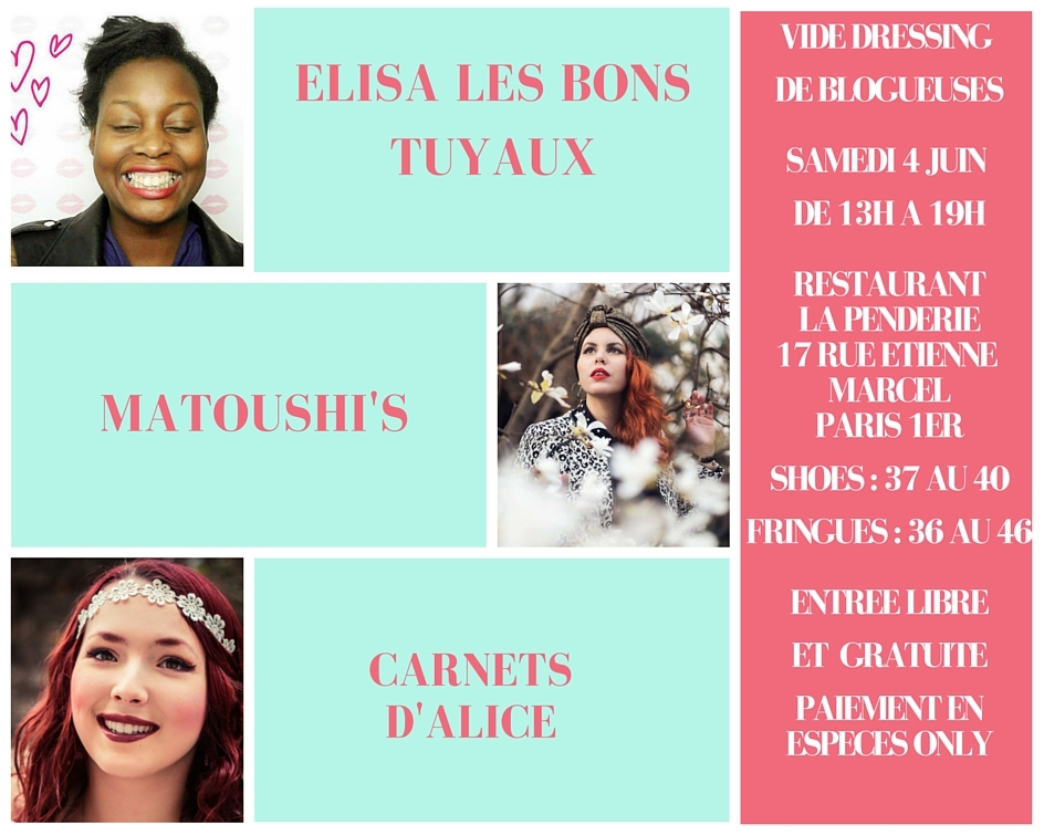 Après le succès des deux éditions, le vide-dressing de blogueuses est de retour le samedi 4 juin de 13h à 19h avec Elisa Les Bons tuyaux, Matoushi's et Les Carnets d'Alice.
