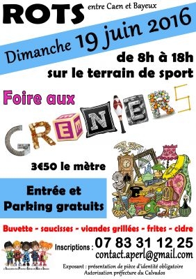 L'APERL (Association des Parents d'Elèves de Rots et Lasson) organise la foire au grenier de Rots le DIMANCHE 19 JUIN 2016.
