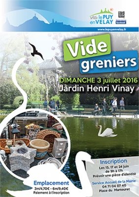 La ville du Puy-en-Velay organise son traditionnel vide-greniers le dimanche 3 juillet. Cet événement exclusivement réservé aux particuliers prendra place dans l'enceinte du jardin Henri Vinay de 8h à 18h. Les emplacements se situeront sur l'allée Est et Ouest du jardin. Les personnes majeures intéressées sont invitées à s'inscrire au service Accueil de la mairie du Puy-en-Velay, les 15, 17 et 24 juin prochains.
