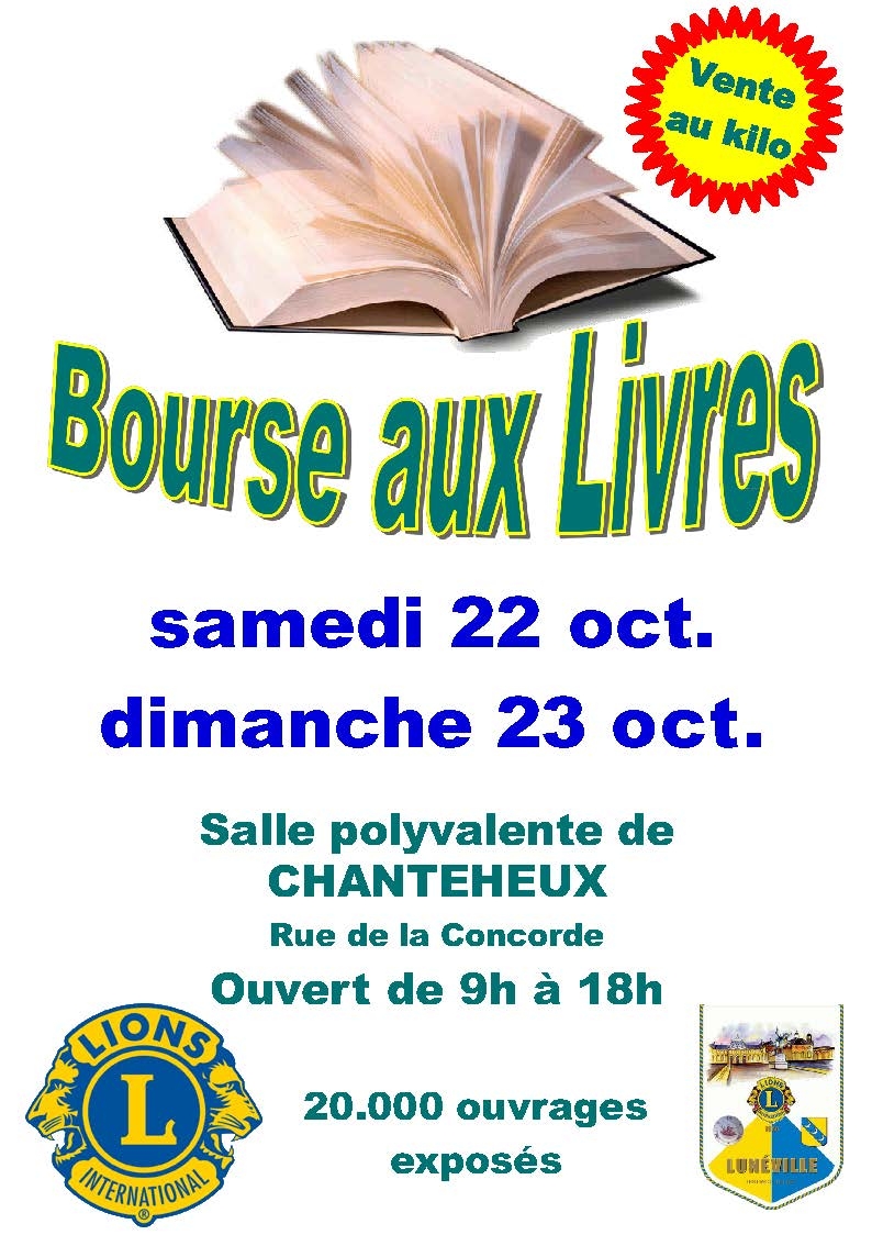 Le samedi 22 et le dimanche 23 octobre 2016, de 9h00 à 18h00 (non-stop) le Lions Club de Lunéville tient sa bisannuelle Bourse aux Livres d'occasion.