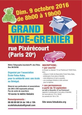 Organisé en solidarité avec l'école Keur Fatou Kaba au Sénégal, à qui va l'intégralité des recettes de location des emplacements. Plusieurs cafés et restaurants sur place. Rue agréable avec un square, où on peut chiner en famille.