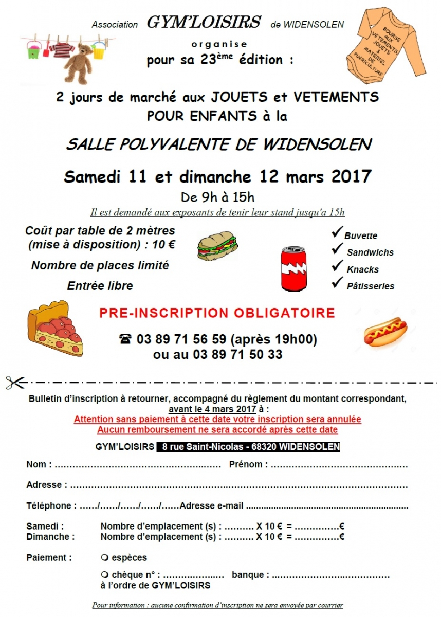 L'association Gym Loisirs de Widensolen organise son 23ème marché de printemps aux jouets, livres et vêtements pour enfants le samedi 11 mars 2017 de 9h à 15h et le dimanche 12 mars 2017 de 9h à 15h à la salle polyvalente de Widensolen.
