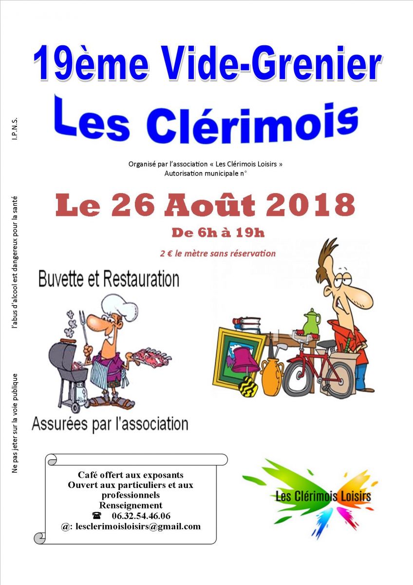 L'association Les Clérimois Loisirs organise son 19àme Vide-Greniers le 26 août 2018, de 6h00 à 19h00.