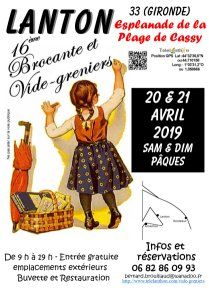 Au profit du Téléthon 2019, 16° Foire à la Brocante et Vide-Greniers les 20 et 21 avril 2019 (samedi et dimanche de Pâques) sur l'esplanade de la plage de Cassy à Lanton 33138.