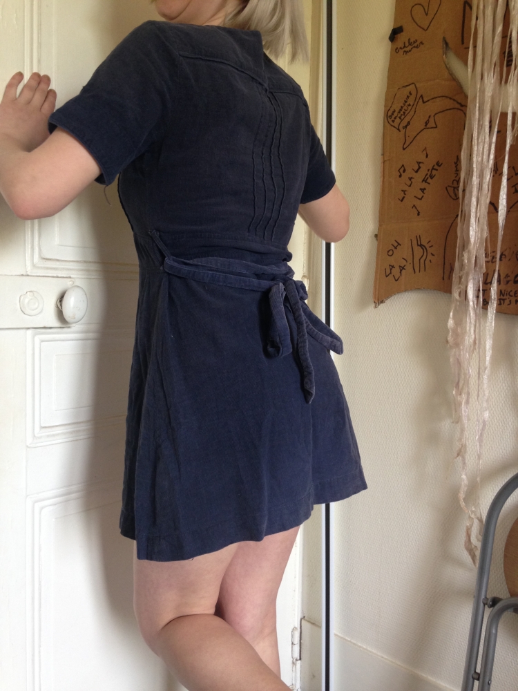 Robe en velour côtelé bleu marine très courte. On a passé de bons moments ensemble.