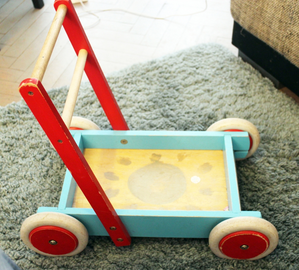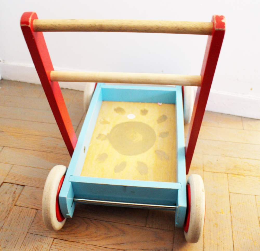 Chariot roulant parfaitement de couleur bleu ciel et rouge .