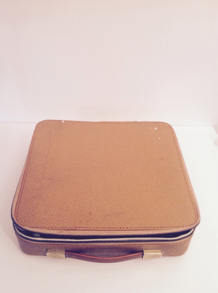 Malette aspect cuir, zippé, état correct, coloris camel (sympa aussi)