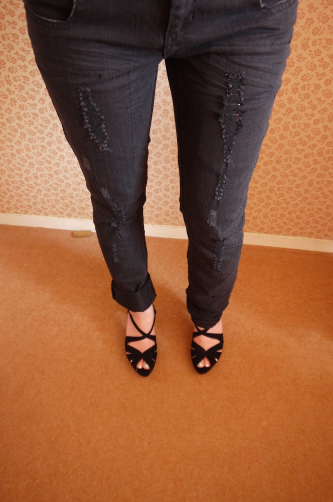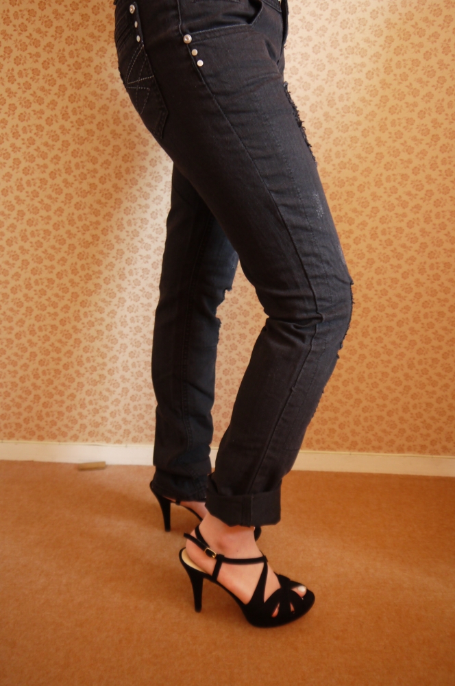 Jean skinny noir effet destroy, il y a des sequins en dessous des trous. Porté une fois, trop large pour moi. En très bon état !