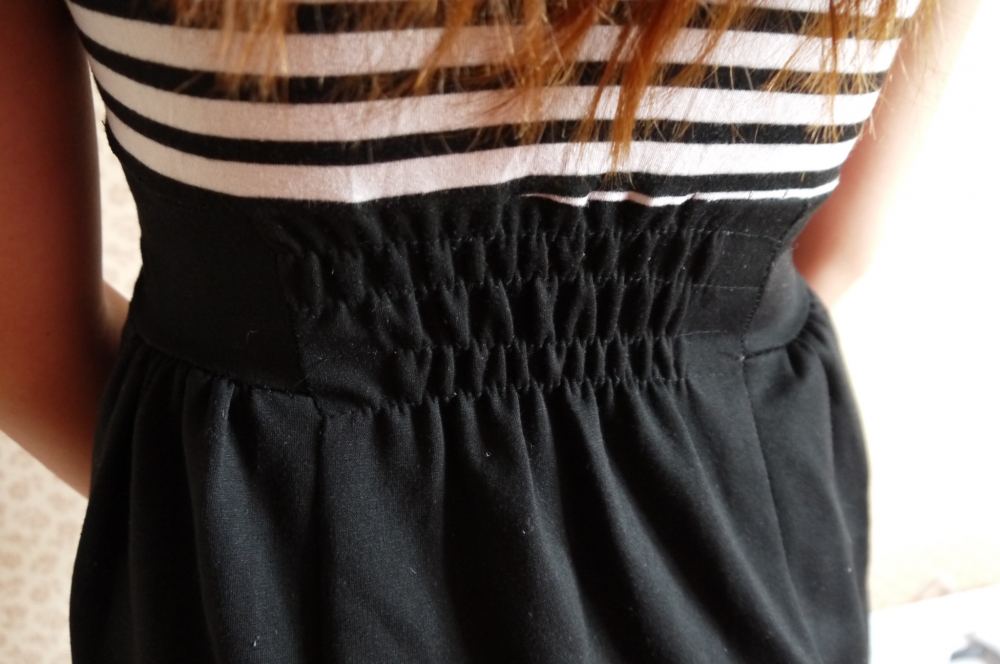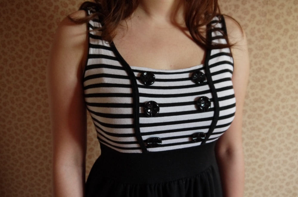 Robe marinière à rayure de couleur blanc et noir, noir en bas de la robe, cintrée à la taille, comporte des boutons de décoration au niveau du buste, smockée au dos, il y a des petits trous au niveau de la couture (voir photo). En bon état, taille 36 environ