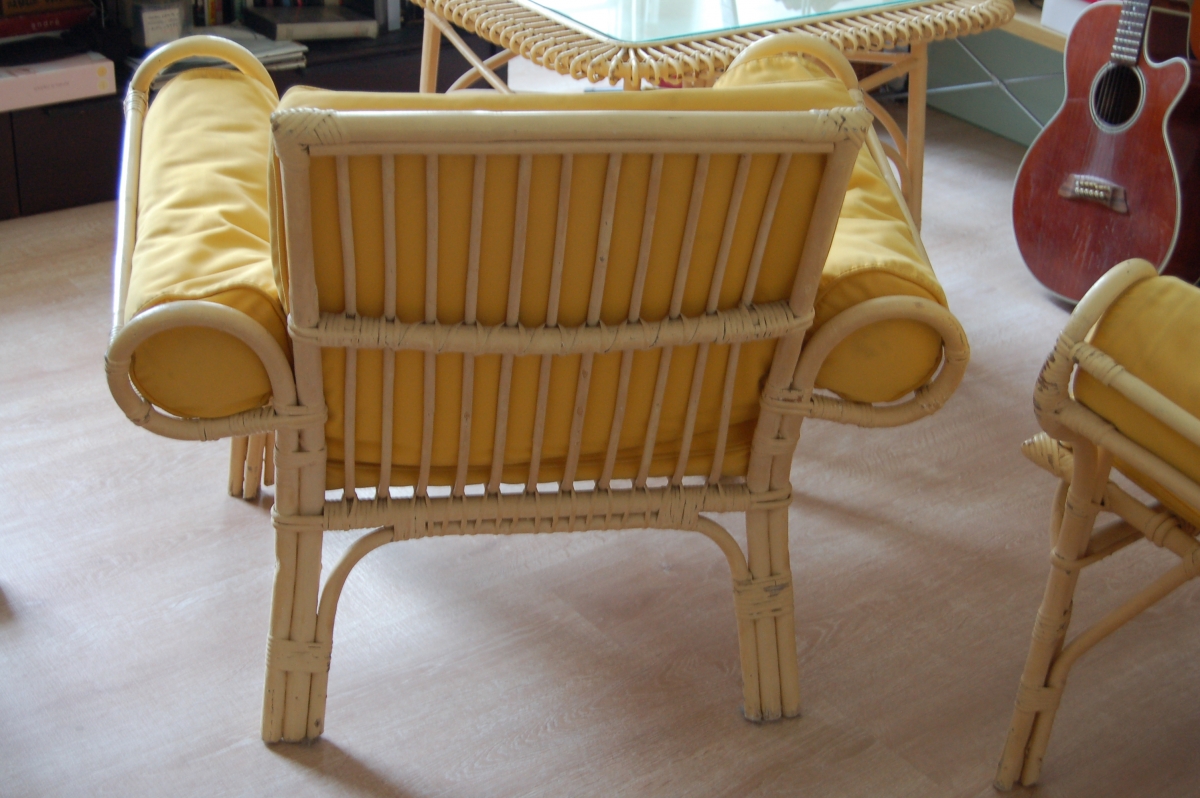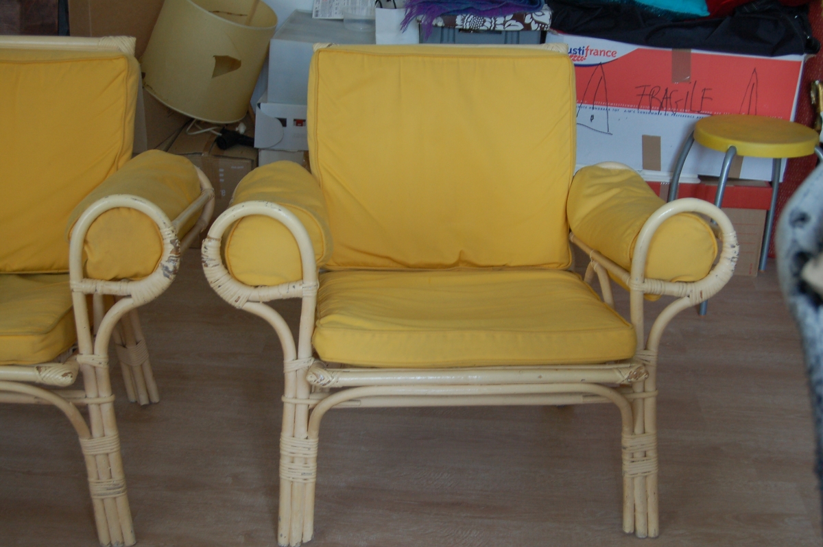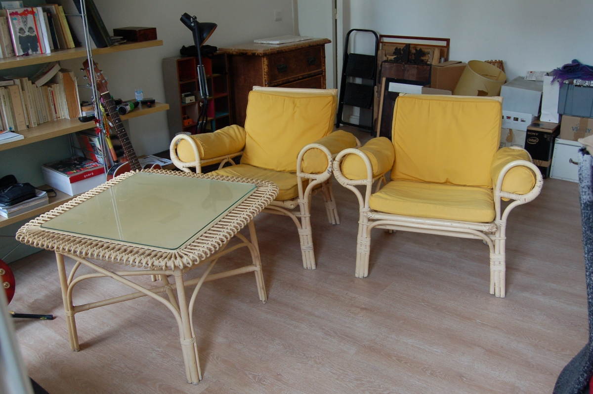 Je vends cette table basse et ses deux fauteuils en rotins datant des années 70.