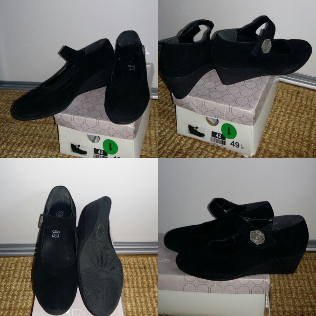 Escarpins noir à talons compensés, marque Gémo, très bon état, pointure 42, dessus et semelles intérieures cuir, talons compensés 6 cm.
