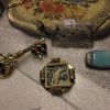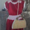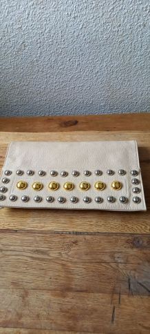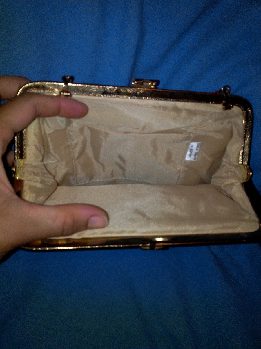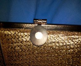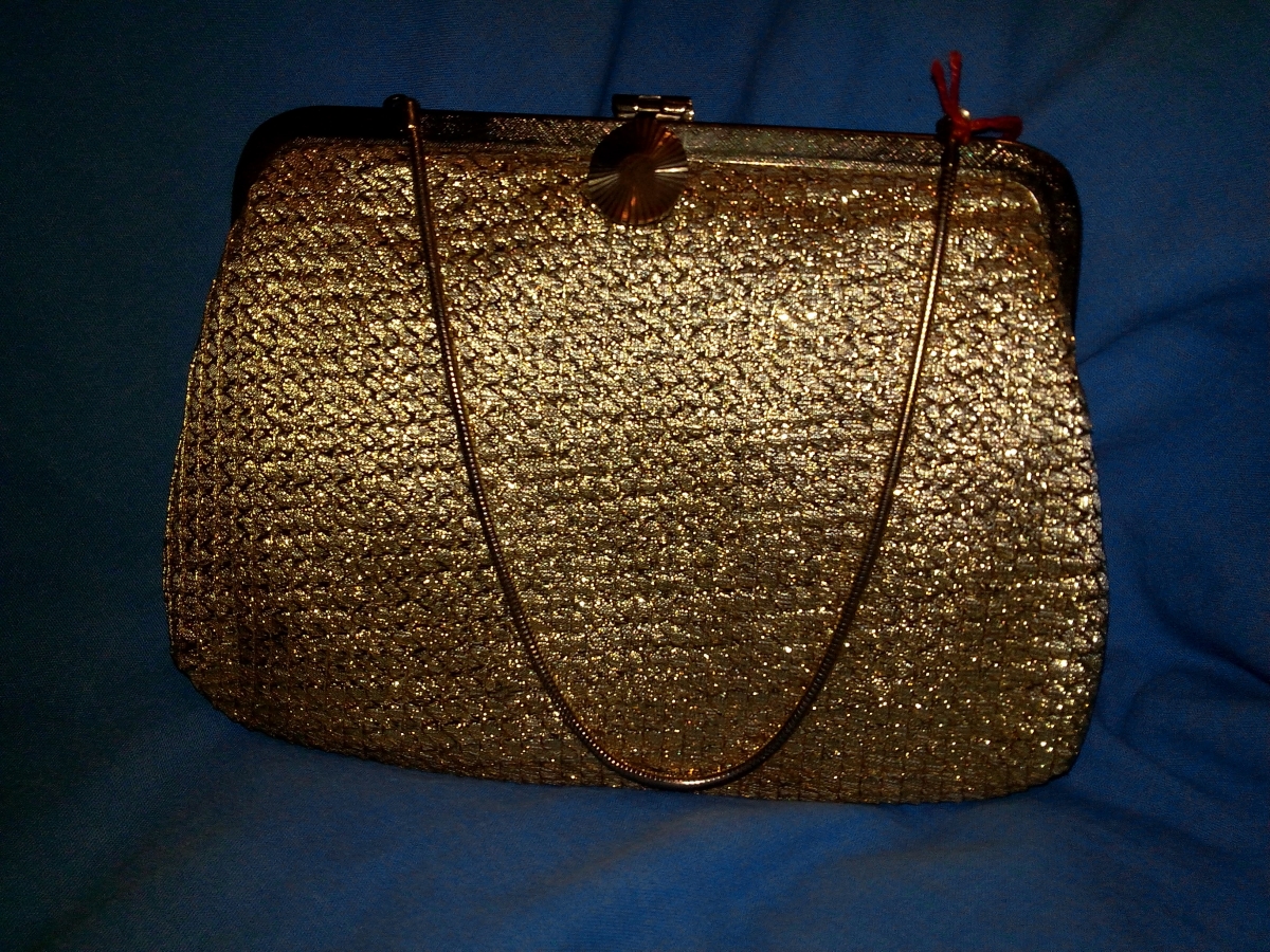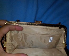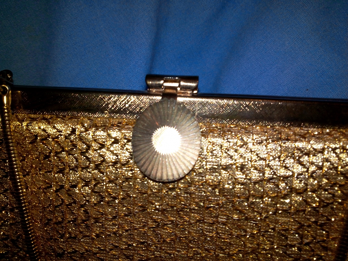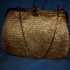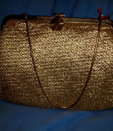 pochette vintage made in "hong kong", en tissu doré, anse en chaine maille serpent doré, très bon état
