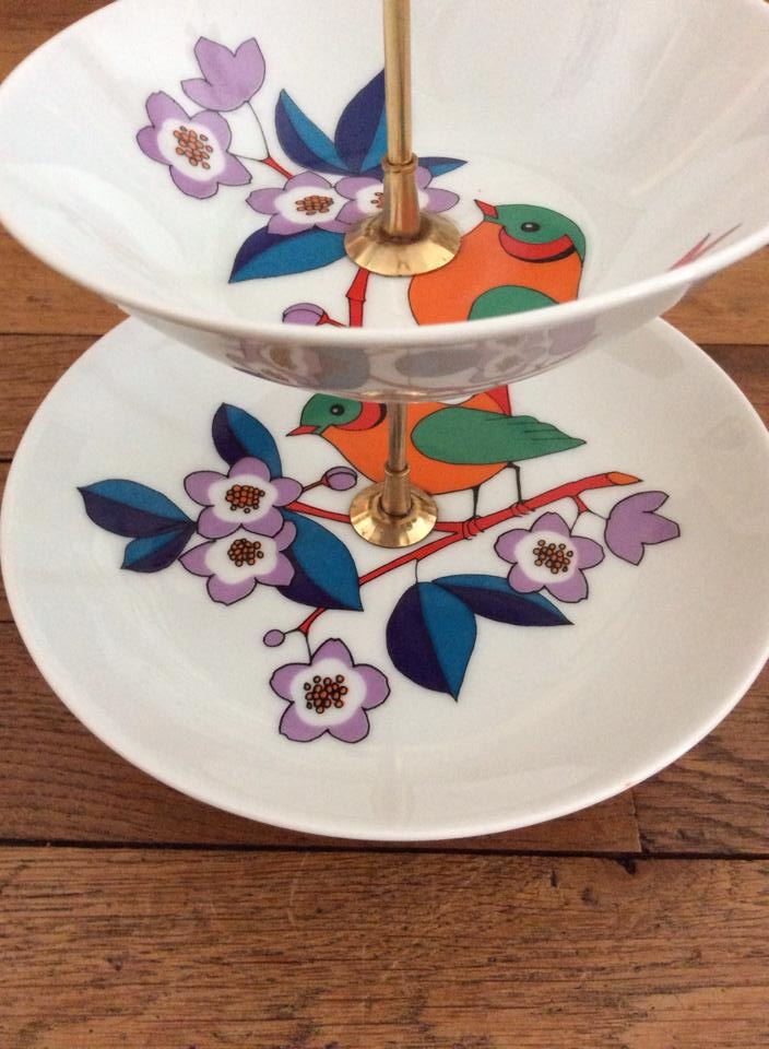 Double présentoir gâteaux vintage motif oiseaux
