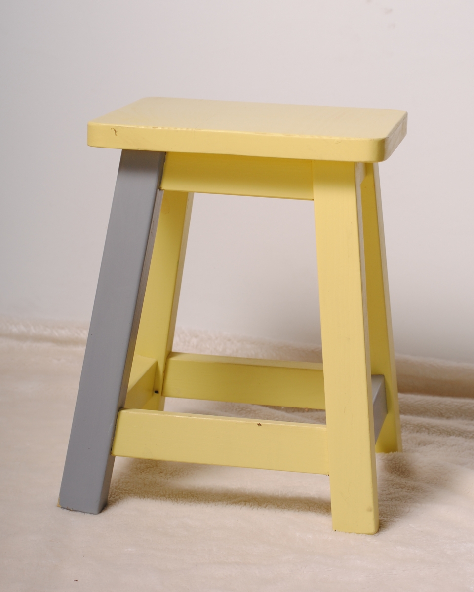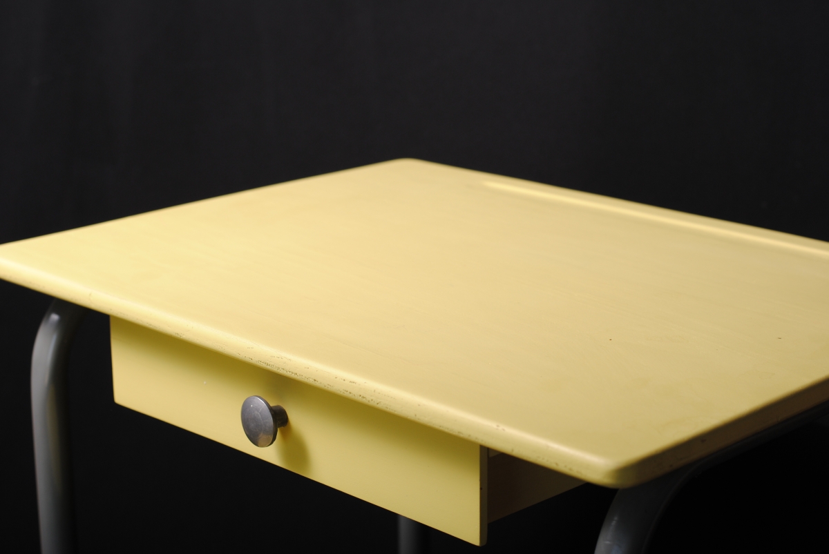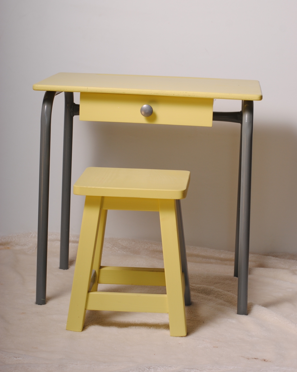 Petit bureau jaune et gris, les pieds sont en métal , le plateau et le tabouret en bois