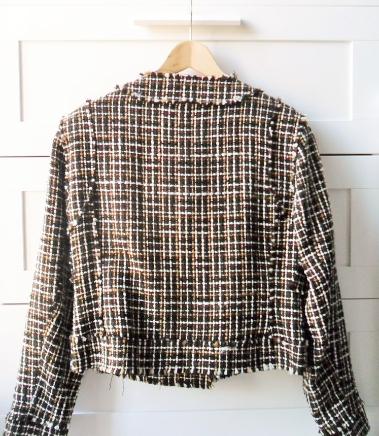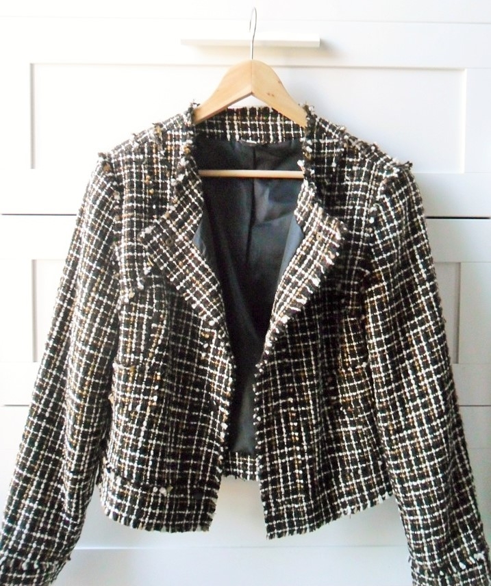 Veste courte épaisse et doublée de couleur marron avec des petites franges. Fermeture à pression. Neuve jamais portée.