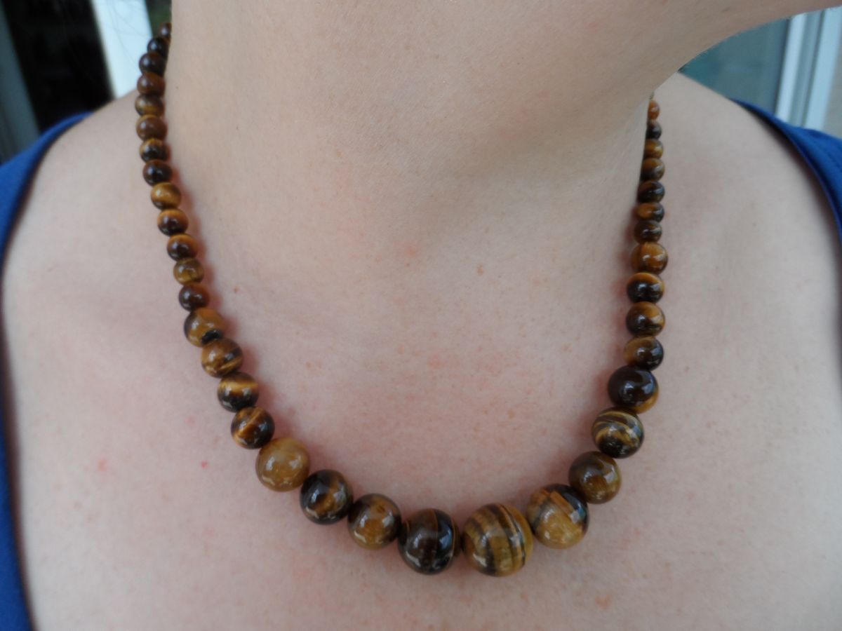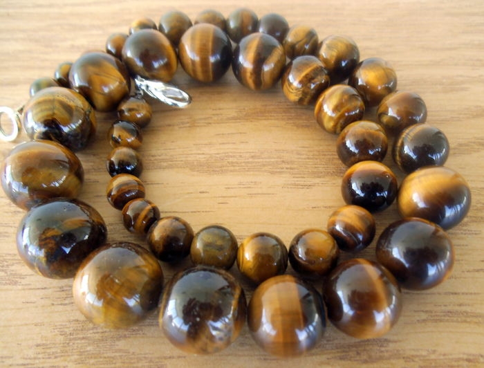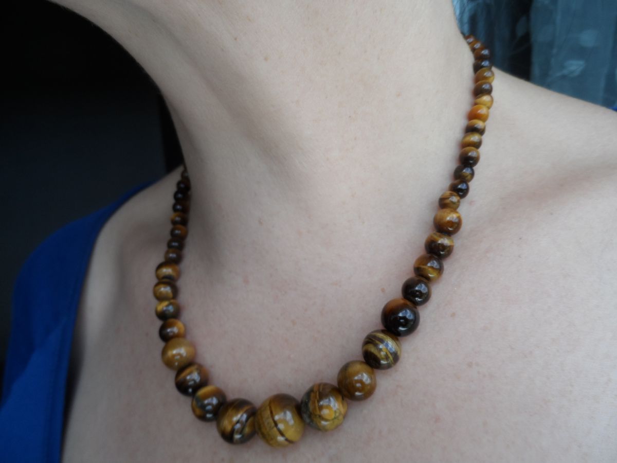 Magnifique collier avec véritable pierre Oeil de Tigre Longueur collier : 44 cm Fermeture avec fermoir mousqueton Diamètre pierre : de 6 a 14 mm