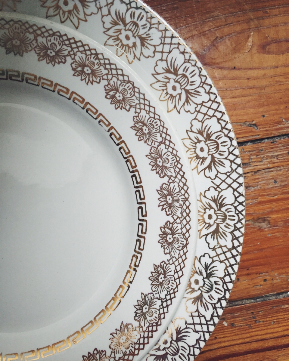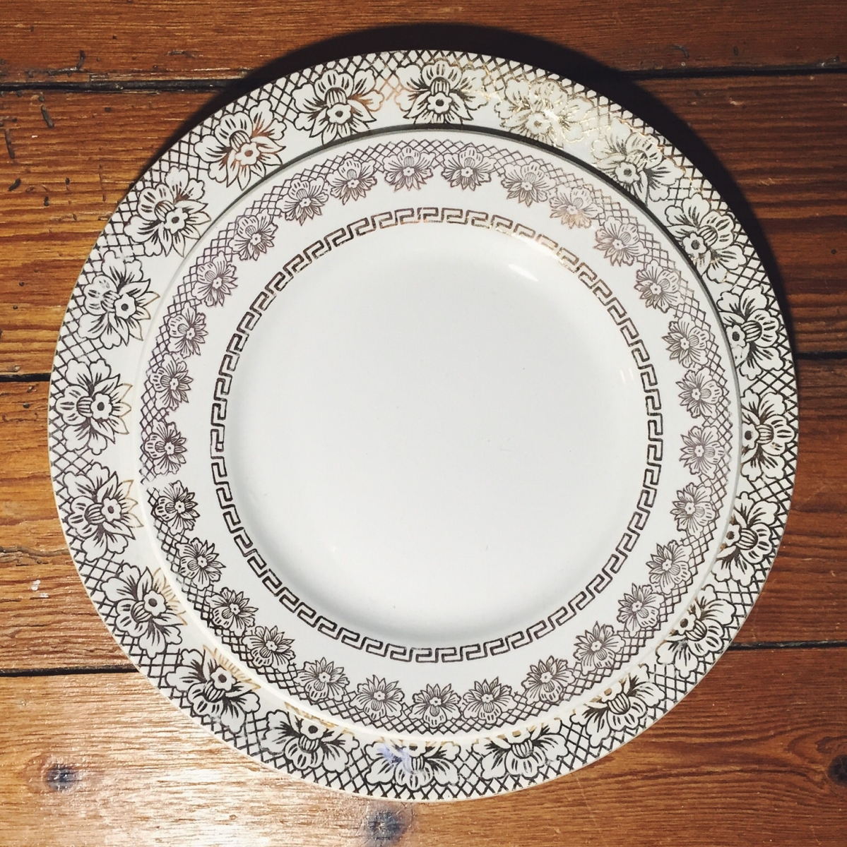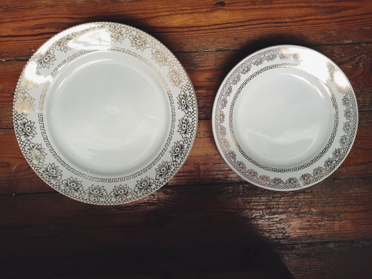 Magnifique ensemble de 8 assiettes rétro blanches et dorés.