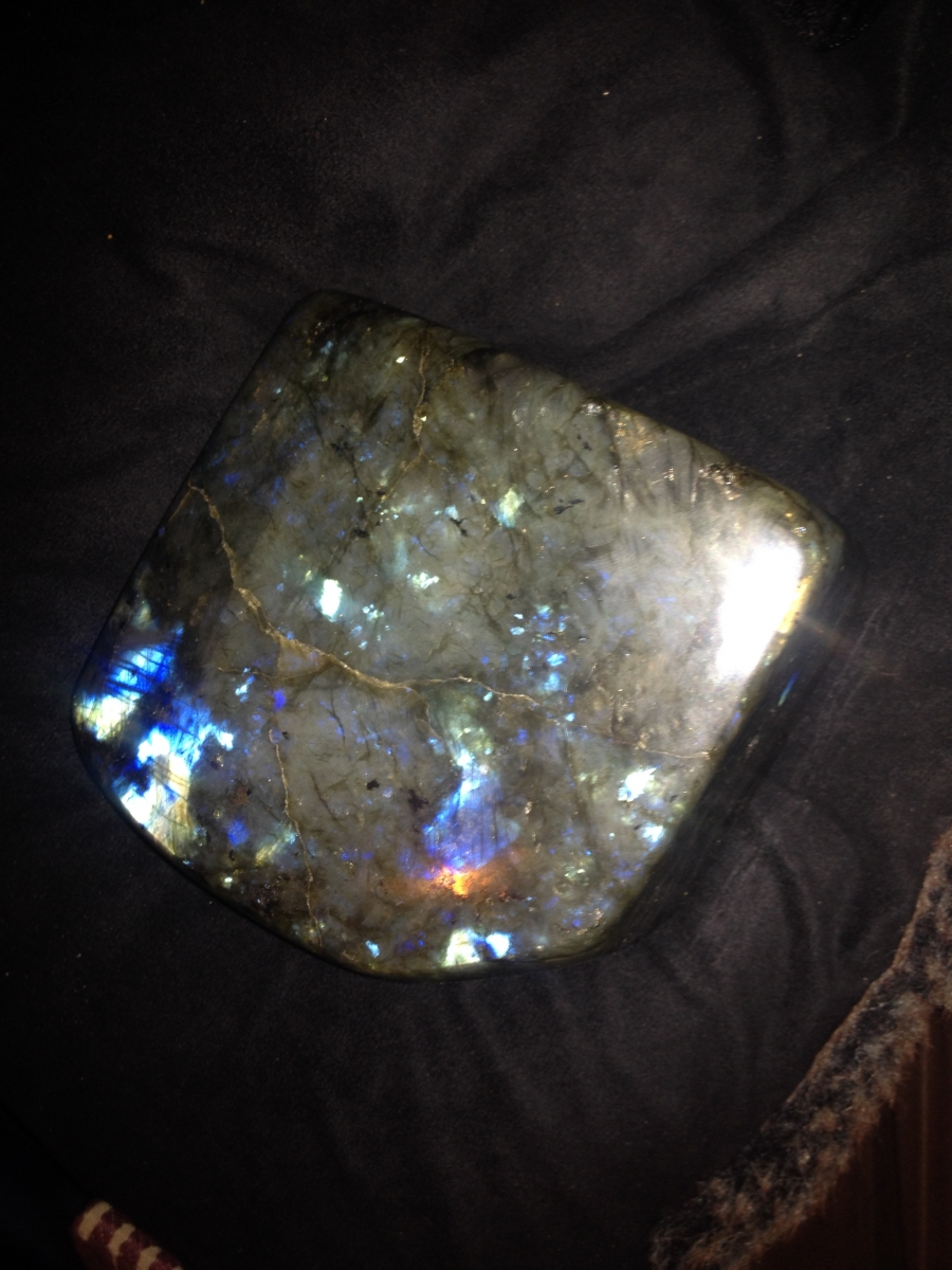 Labradorite 1,6kg avec surface plate pour ce poser sur un meuble belle énergie souvent nettoyer sous l'eau claire merci de votre confiance envoie bien protéger