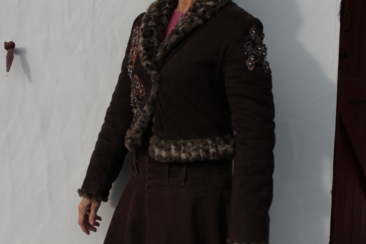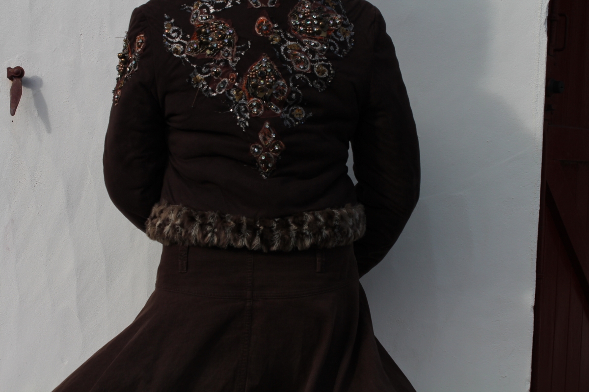 Il y a des empiècements de perles colorées au dos, sur le devant, et sur la manche gauche. (voir photos)