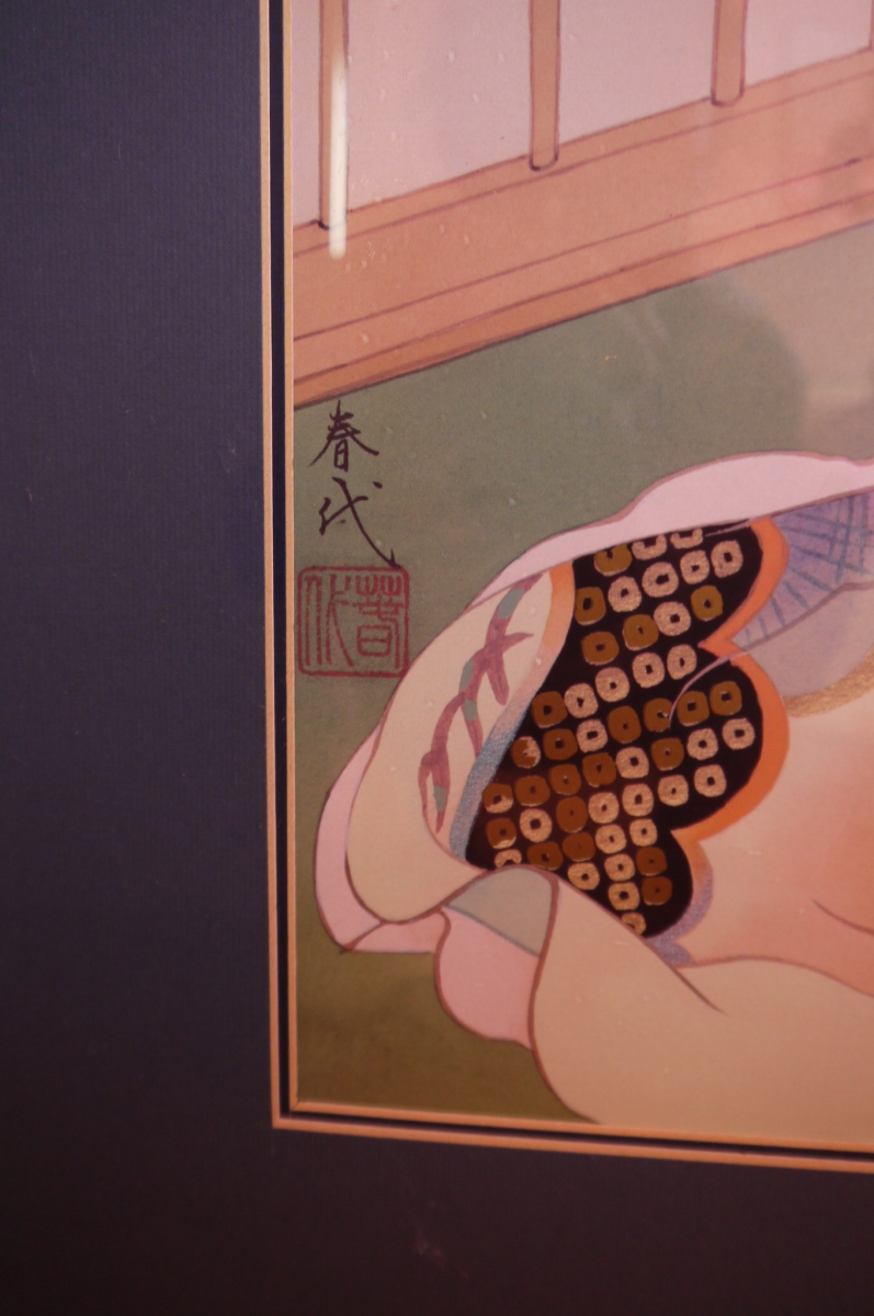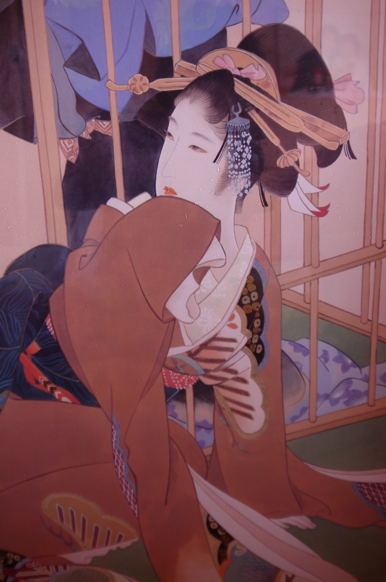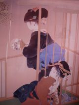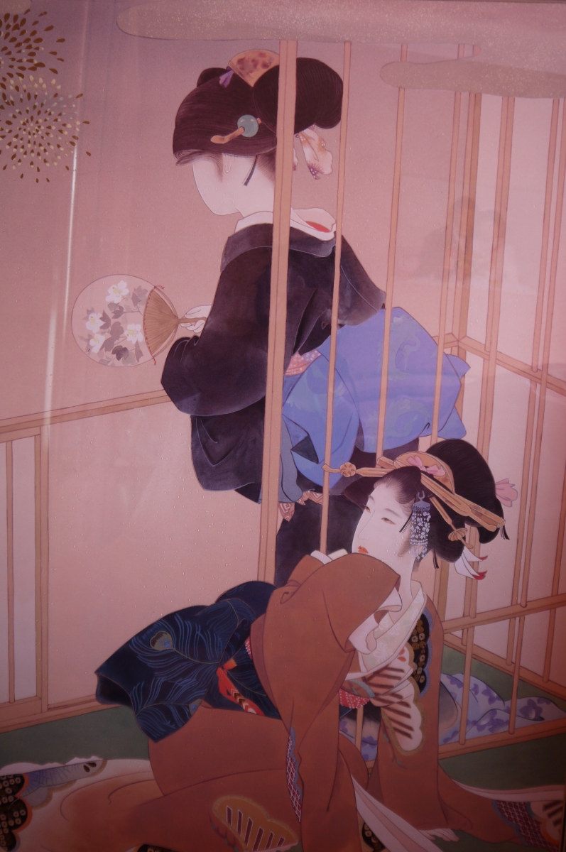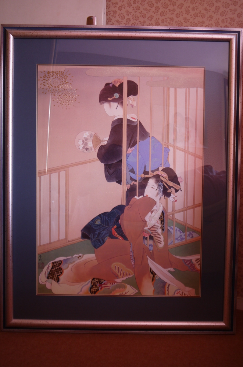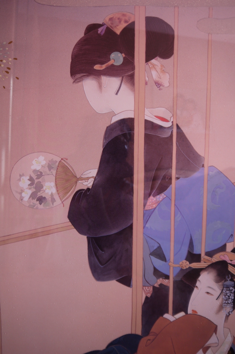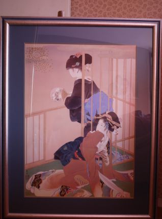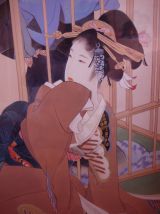 Tableau japonais représentant des geishas, fourni avec son cadre. En très bon état.