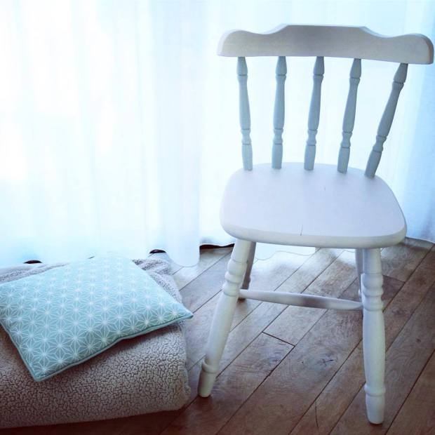 Quelques marques dans l’assisse en bois témoignent de son passé, ce qui fait également le charme de la chaise.