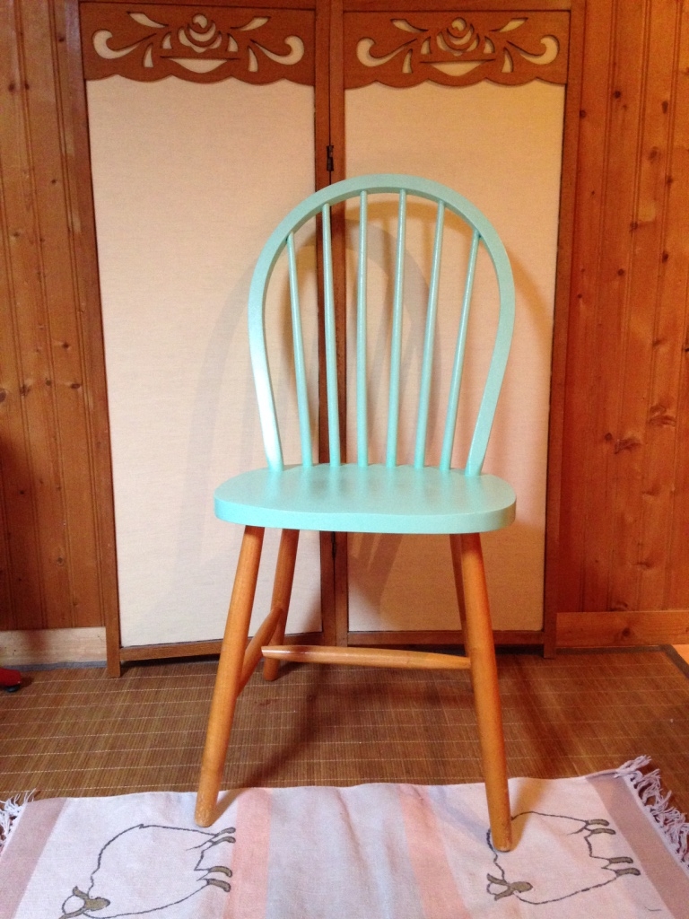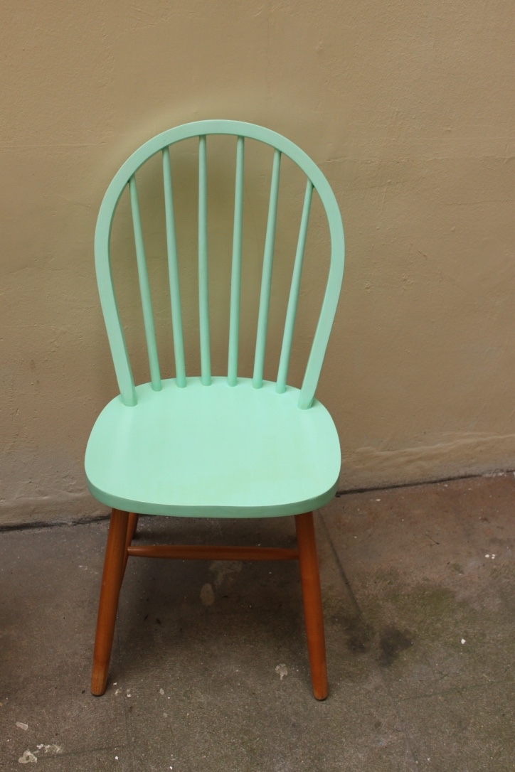 Jolie chaise scandinave style Ercol années 60 70, à barreaux repeinte en un doux ton de vert. Parfaite autour d'une table de cuisine avec d'autres chaises dépareillées ou derrière bureau d'adulte ou d'enfant pour une touche à la fois fun et rétro dans votre déco. Se marie avec une décoration intérieure design vintage ou moderne. Dossier arrondi, pieds compas, A venir chercher en mains propres à Paris près de Place de Clichy ou livraison possible sur Paris.