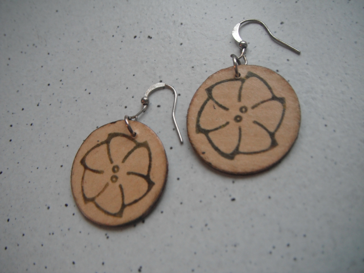 Paire de boucles d'oreilles fantaisie "Fait main" en carton et papier. Très légères. Décorées avec tampon et encre.