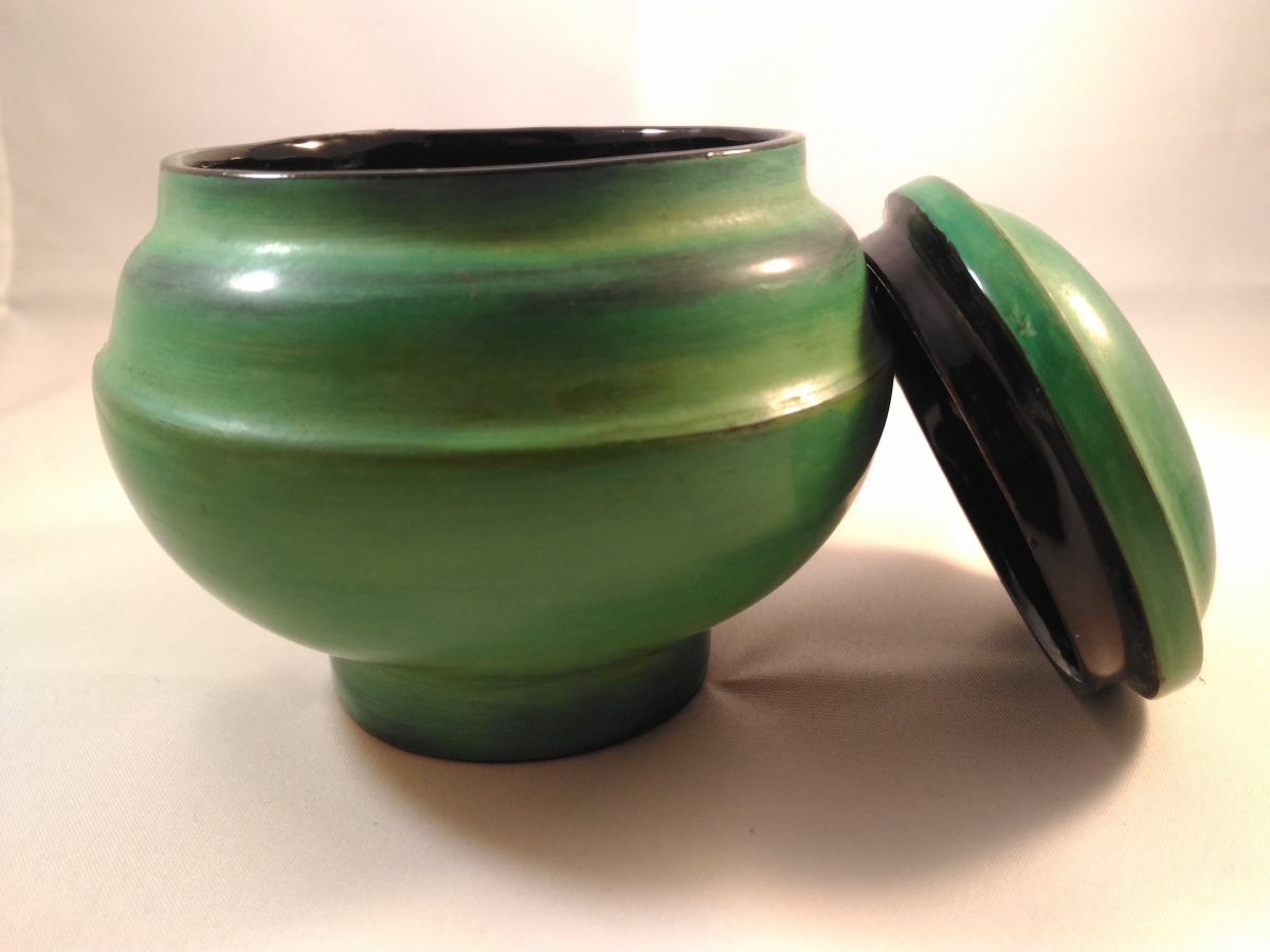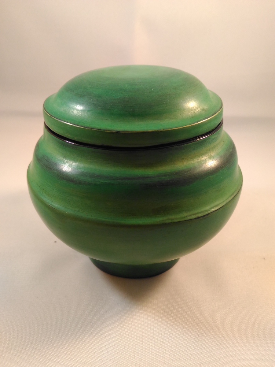 Ce petit sucrier vert est constitué de bambou. Il est laqué d'une dizaine de couches de laque afin de le protéger. Il s'agit d'artisanat typique birman.