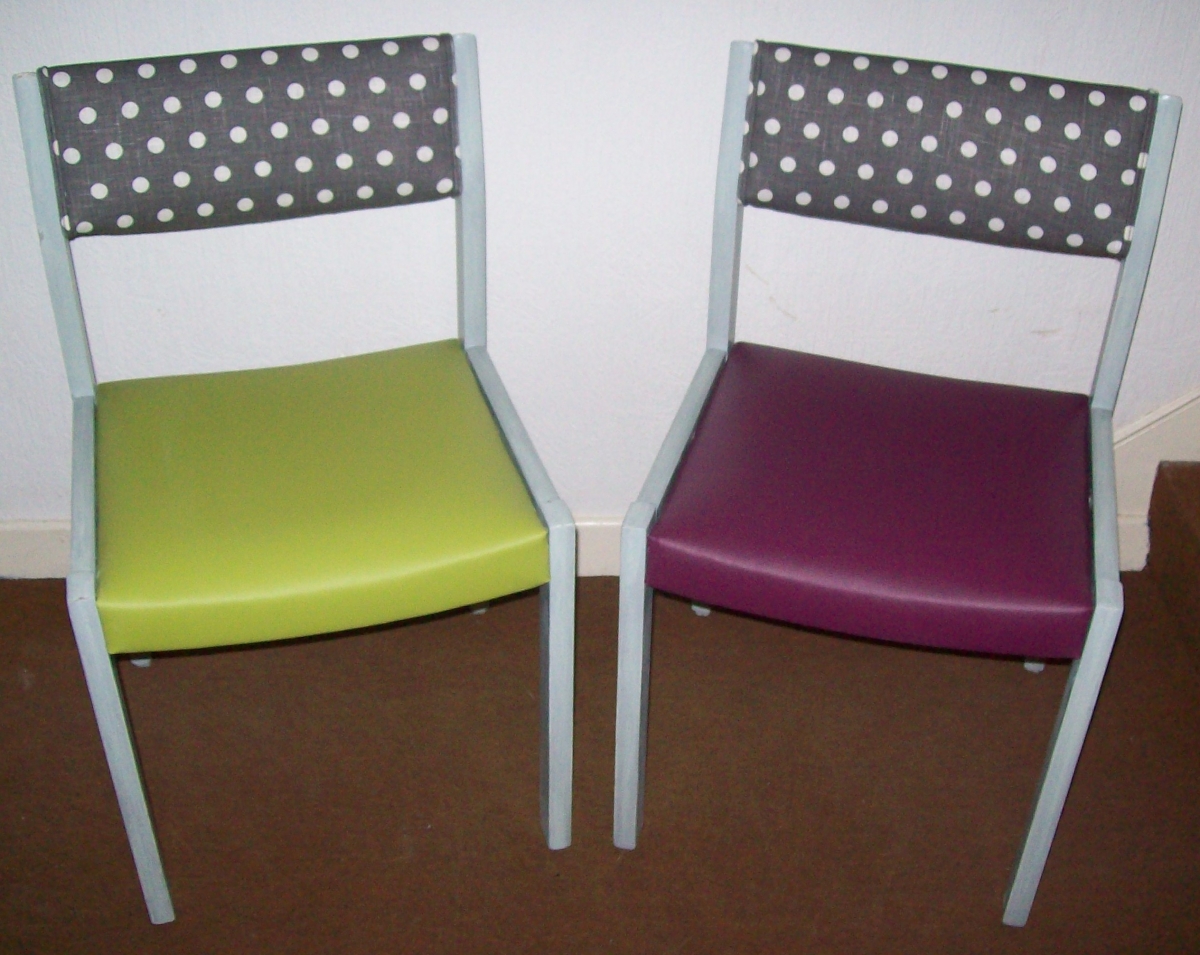 Lot de 4 chaises refaites à neuf. Idéales pour la cuisine avec leur assise en simili-cuir qui se nettoie d'un coup d'éponge (2 vertes pistache et 2 prunes). Le dossier est en lin gris foncé.