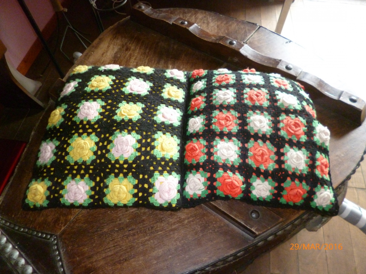 lot de 2 coussins crochets bon etat d origine meme dim le tissu du derriere n est pas le meme l un satin rouge l autre tissu epais jaune dim 50 par 39 reste ok