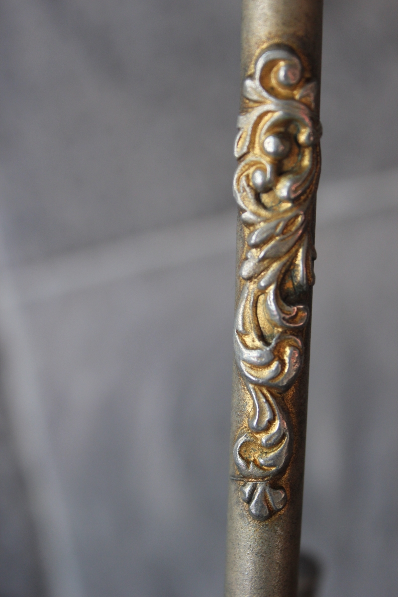 Tige et poignée en métal laitonné ou bronze. Armature métal également. Ouverture et fermeture fonctionnelles, mais à manier avec précaution bien sûr.