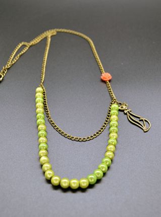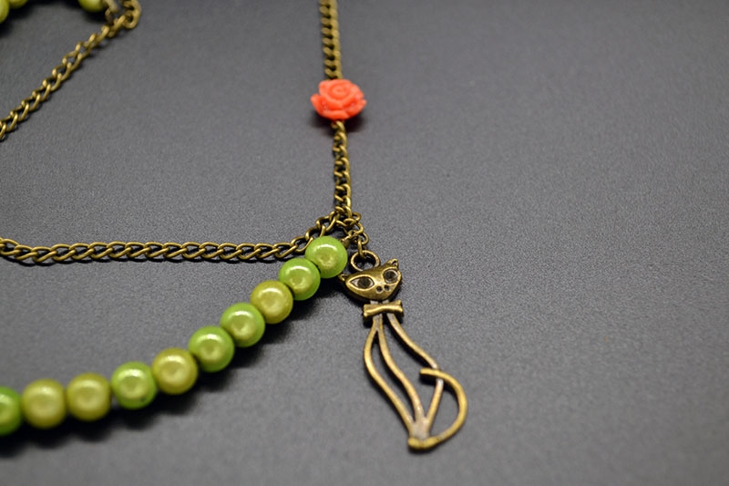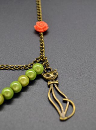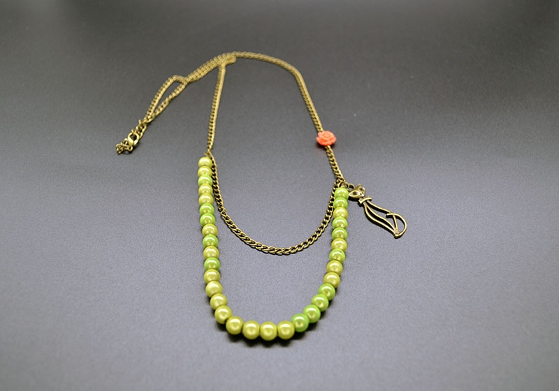 COLLIER PERLES MAGIQUES ET CHAT METALLIQUE