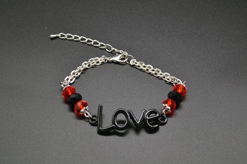 Bracelet métal argenté agrémenté d'un connecteur "LOVE" en métal noir et de perles en verre cristal.