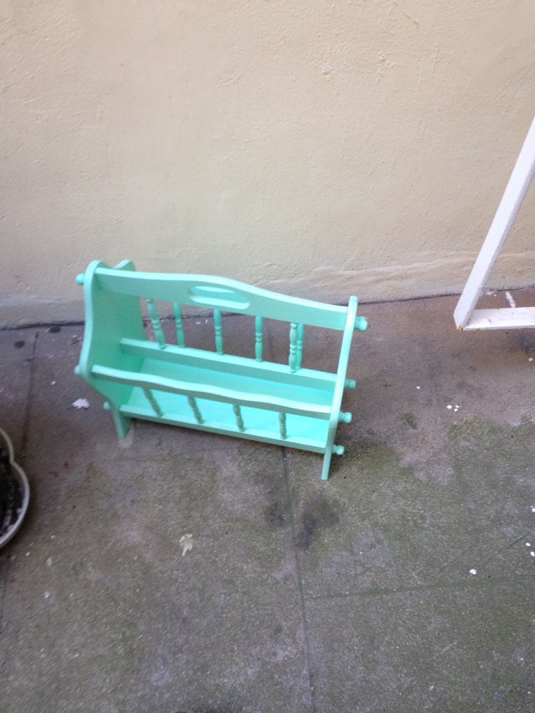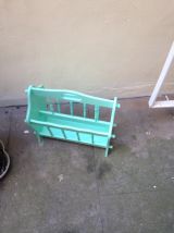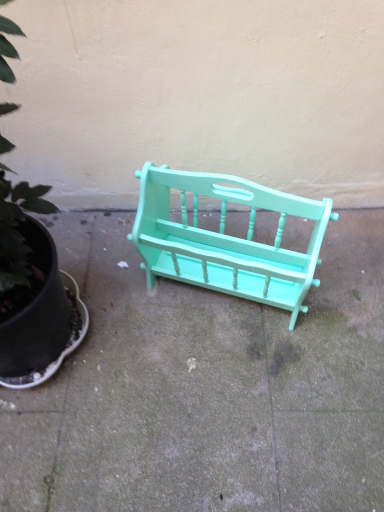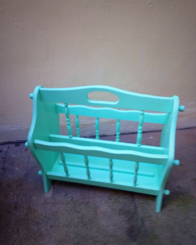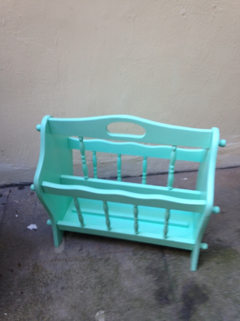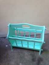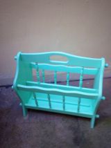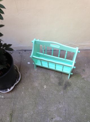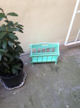 Porte revue rétro vintage en chêne massif rénové et repeint en vert d'eau pastel. Tiroirs au fond en vinyle marbré. Comporte quelques irrégularités de peinture. Idéal avec une déco pop, moderne ou scandinave. Disponible pour remise en mains propres à Paris, près de Place de Clichy