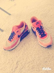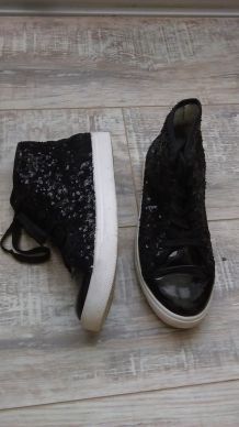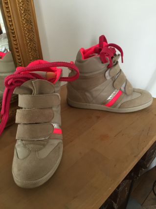 Baskets compensées cuir et daim beige, détails rose fluo et argenté. Très peu portées, état impeccable.