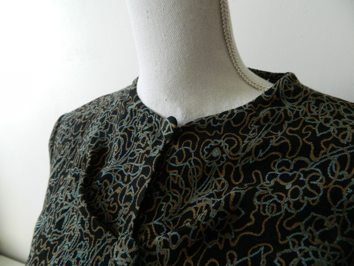 Esprit baroque, avec ses motifs fleuris ocres et bleus gris et ses manches gigots.
