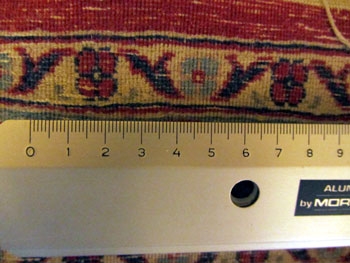 Certains marchands ont tendance à “améliorer” la densité de nouage de leurs tapis, c’est pourquoi il vaut mieux vérifier soi-même par calcul. J’ai photographié ce tapis sur l’envers avec une règle afin que vous puissiez observer la qualité de nouage et calculer la densité de nouage exacte avant de vous décider à acheter votre tapis.