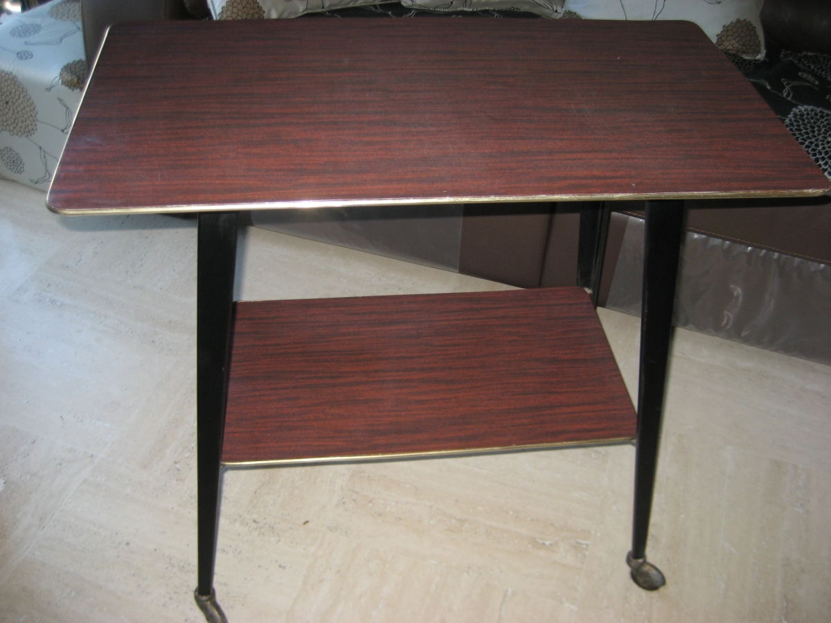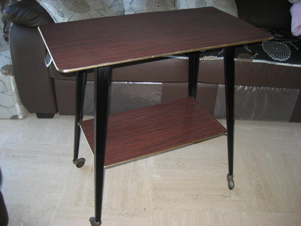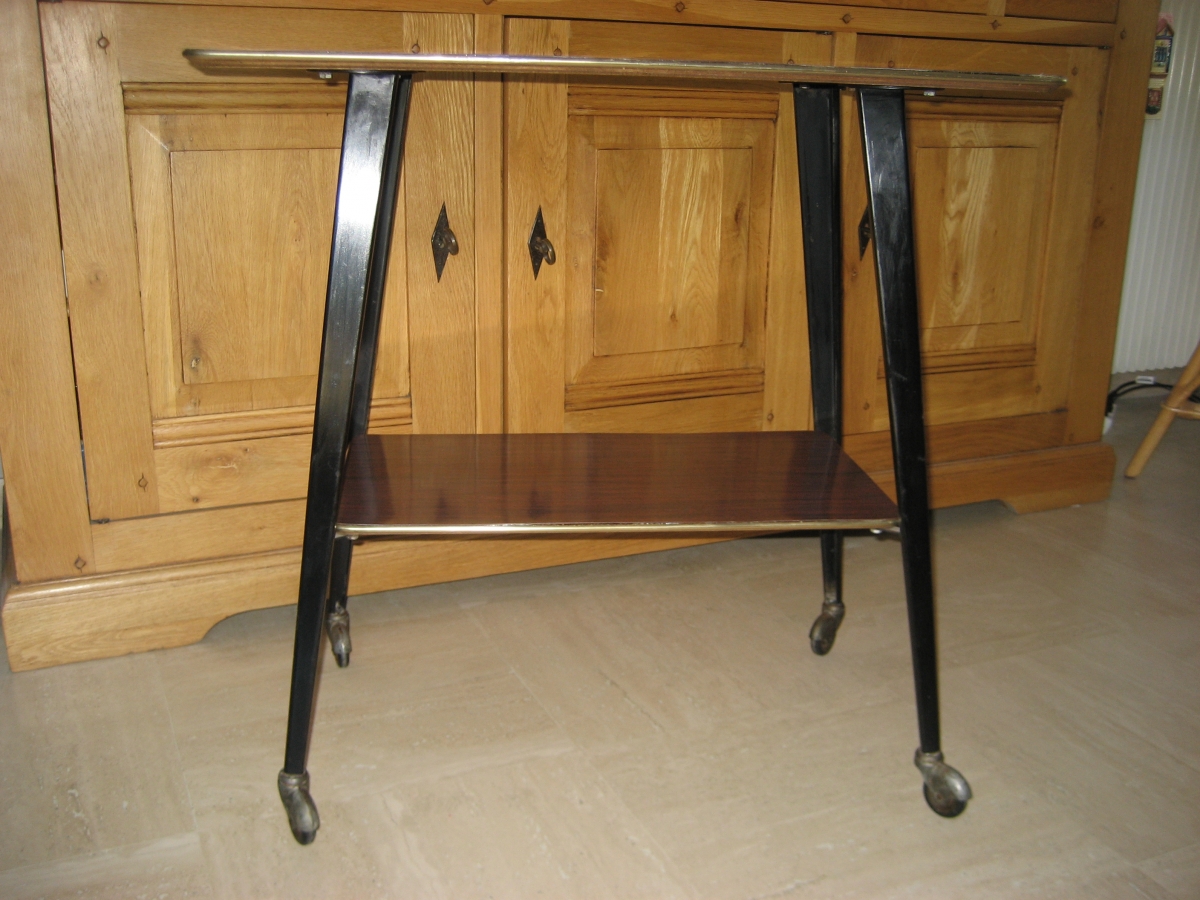 Table à roulettes de télévision vintage en formica des années 60 de couleur: noyer marbré noir.