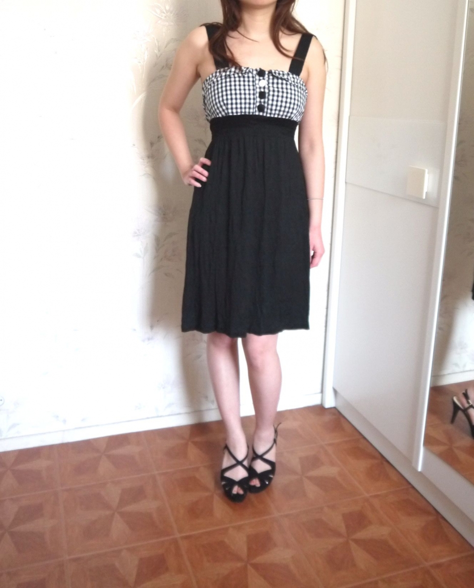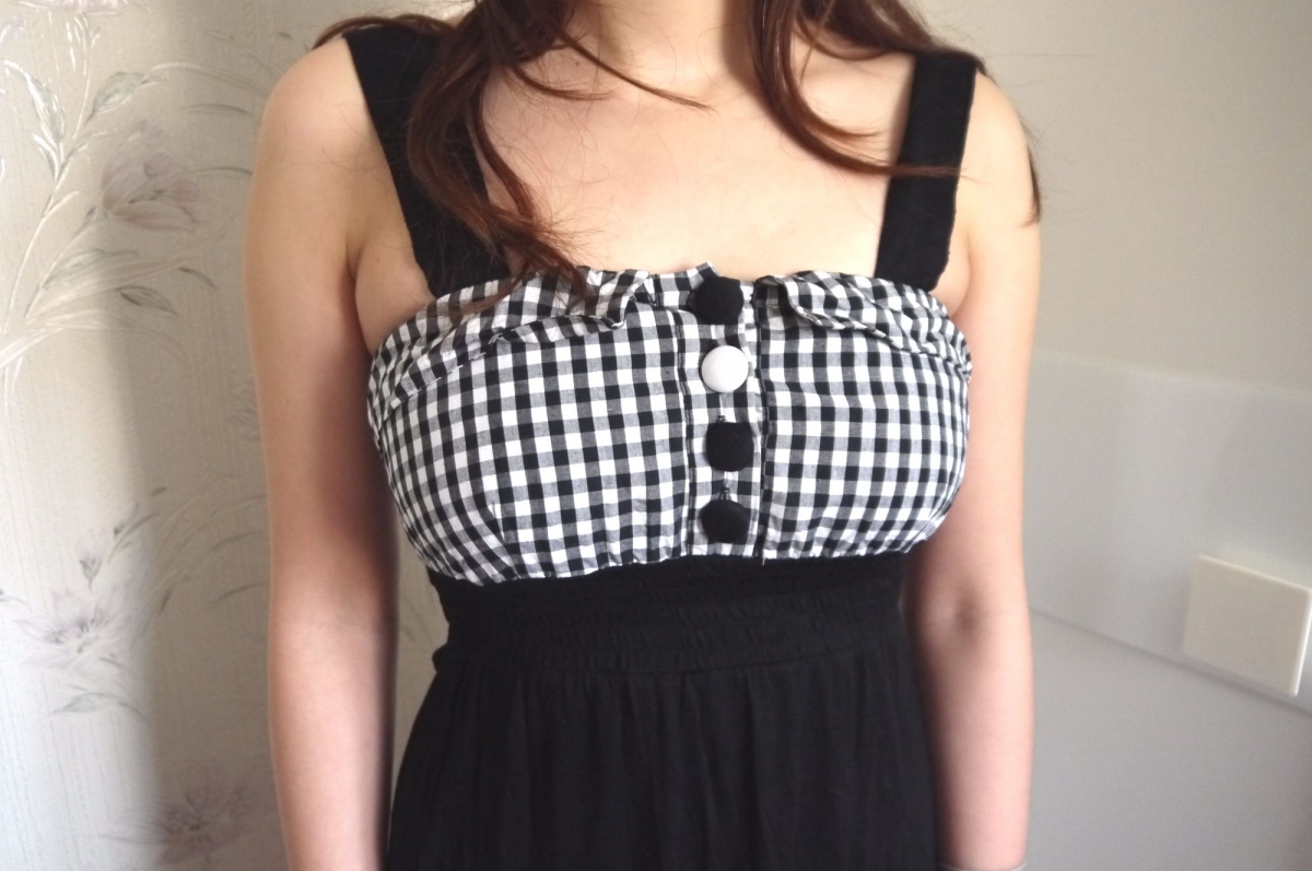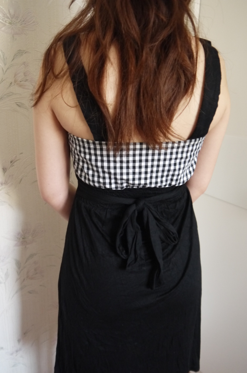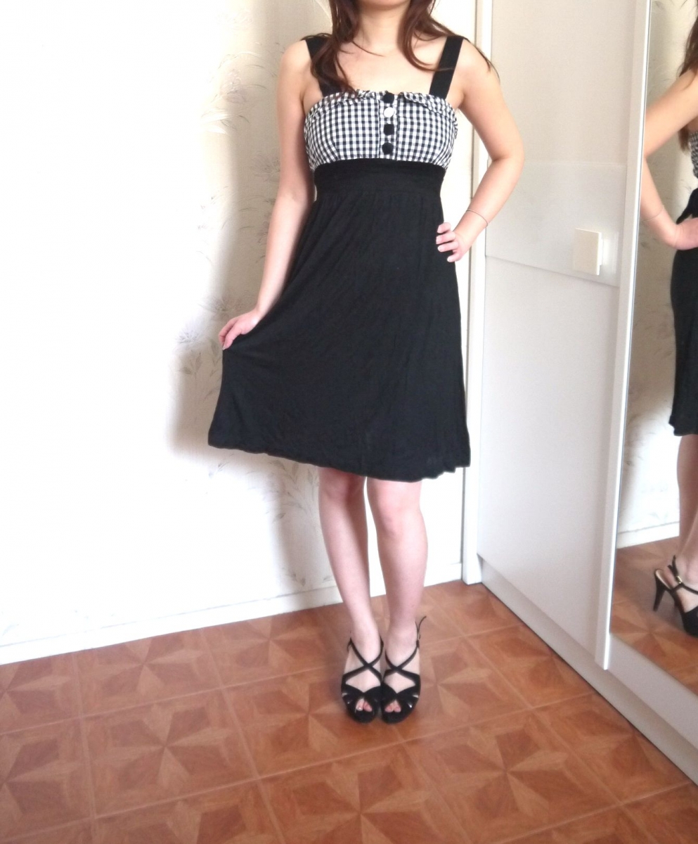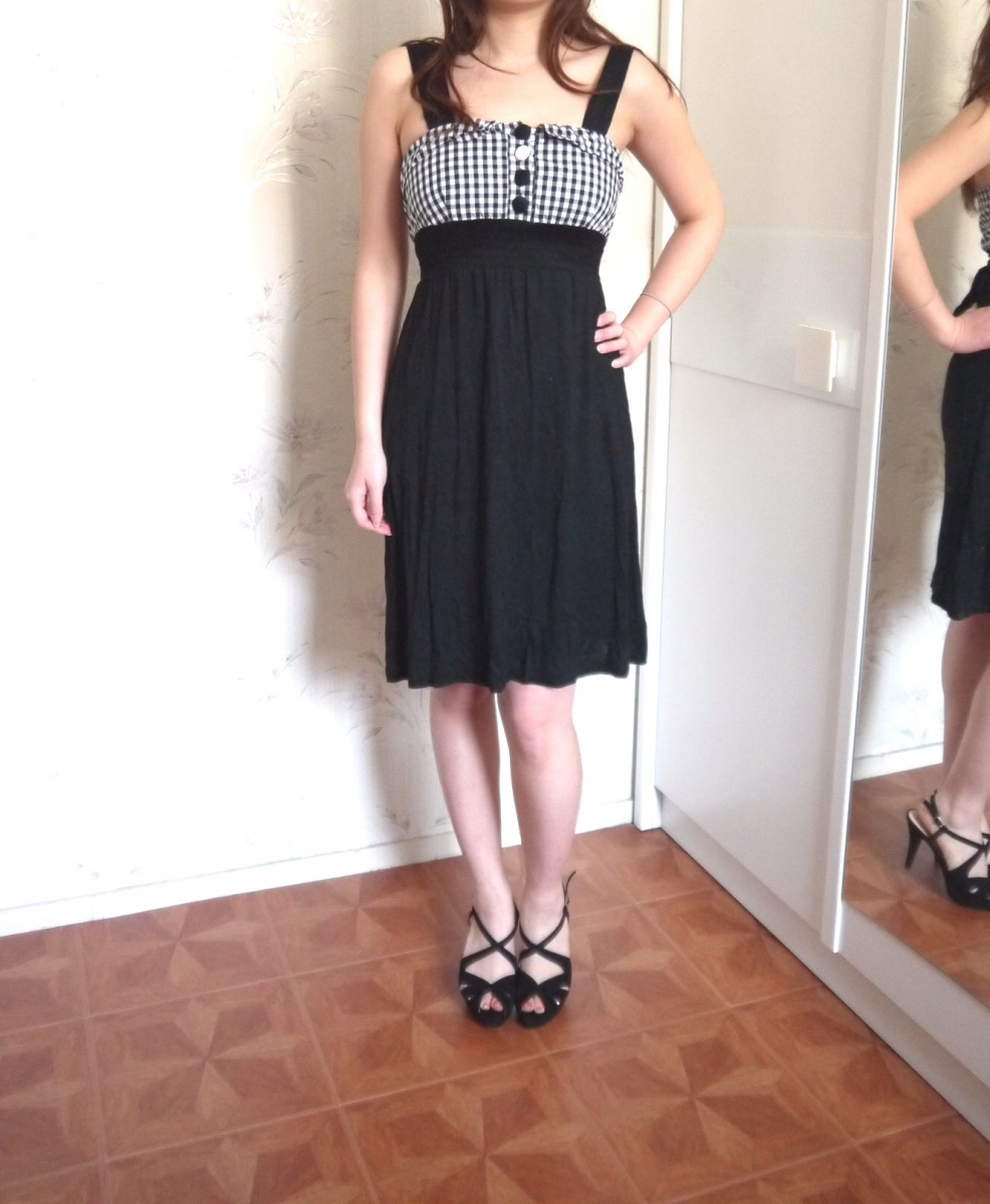 Robe de couleur noire avec le buste à motif vichy (carreaux), bretelles noires larges, ruban / lacet à nouer au dos, boutons décorations devant, matière élastique et agréable à porter. En très bon état, taille 36 / S